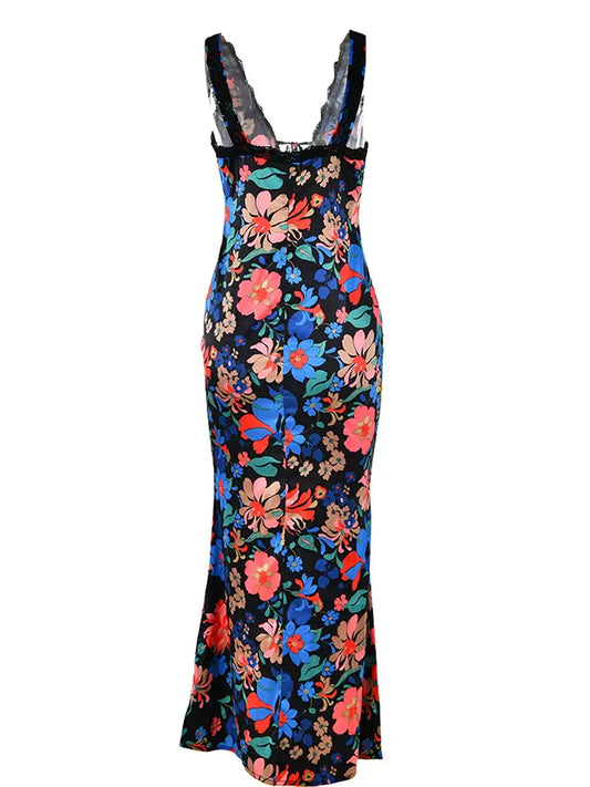 Women Slip Dress Sleeveless V-neck Flower Print Summer Dress Lace Patchwork Long Dress