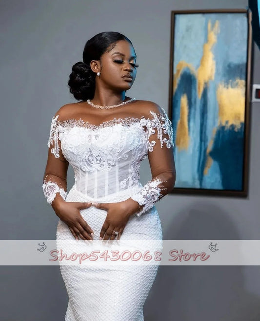 White Pearls Beaded Luxury Mermaid African Wedding Dress Mesh Long Sleeves Aso