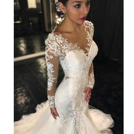 African White Mermaid Wedding Dresses Women Elegant Sheer Long Sleeved Bridal G