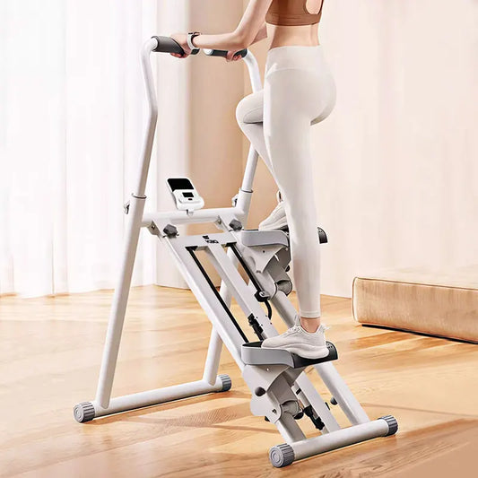 The stair climber has adjustable height, ergonomic handlebars, smooth and quiet dual hydraulic system, and can be folded