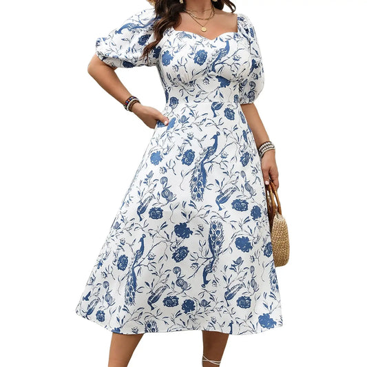 Plus Size Women's Dress Floral Print Short-Sleeved V Neck Loose Long Skirt