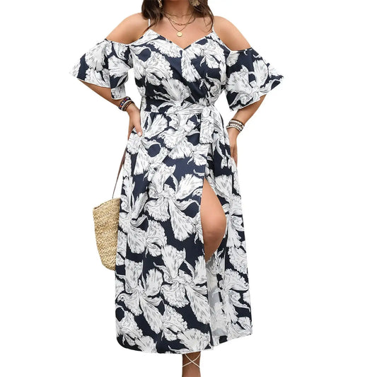 Women Plus Size Floral Print Maxi Dress with Ruffle Sleeves and V Neckline Elegant Belted Long Dress with High Side Split