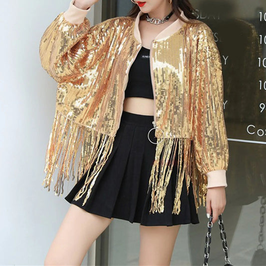 Women's Sequin Tassel Jackets Long Sleeve Front Zip Casual Sparkly Party Fashion coat glitter reversible Hip Hop Jacket
