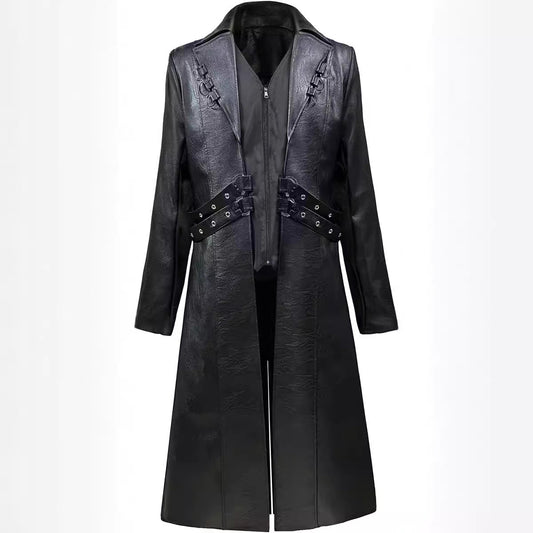 2025 New Steampunk Gothic Mid Length PU Leather Trench Coat Men Dark Brown Blac