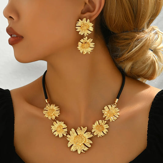 Lxalry Golden Sunflower Jewelry Set - Elegant Black Rope & Gold Flower Necklace and Earrings