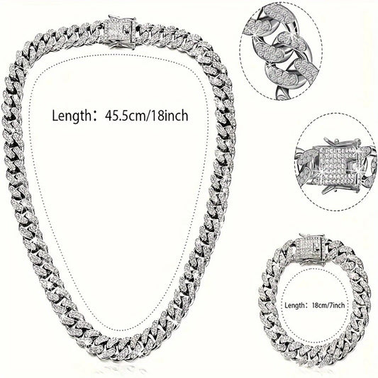 Men's 13MM Cuban Link Chain Necklace & Bracelet Set Silver Miami Hip Hop Jewelry Bling Diamond Choker for Men And Women Jewelry