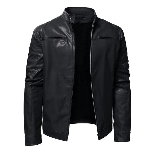 Autumn Mens Stand Collar Jacket Coat Black Leather Motorcycle Jacket Solid Colo