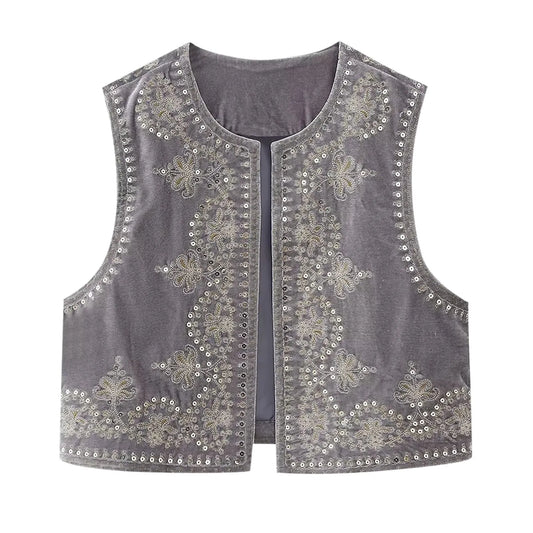 Women Retro Sequin Embroidered Velvet Vest Sleeveless Casual Jacket Vest Spring Autumn Vintage Coats For Women Elegant 2024