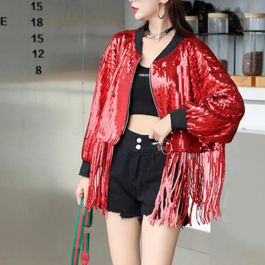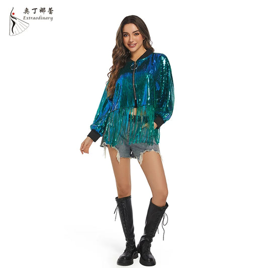 Women's Sequin Tassel Jackets Long Sleeve Front Zip Casual Sparkly Party Fashion coat glitter reversible Hip Hop Jacket