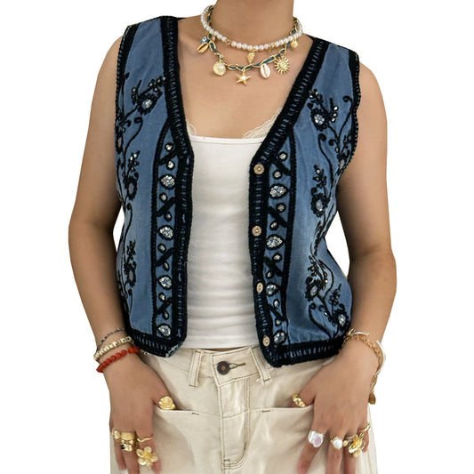 Sleeveless Denim Vest with Sequin Flower Embroidery V Neck Button-up Crop Jean Top for Women Summer Streetwear Fashion