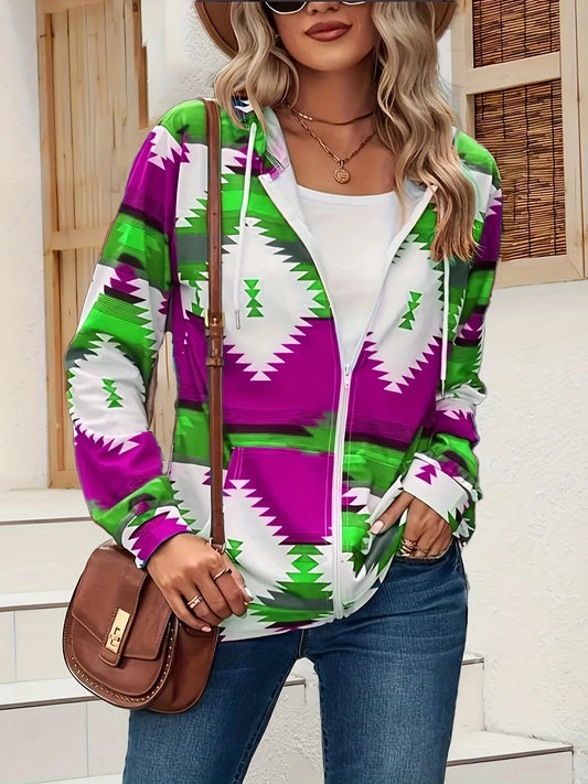 Fall/Winter European and American zipper, hooded, drawstring pocket, printed thin plus size women's long sleeve jacket