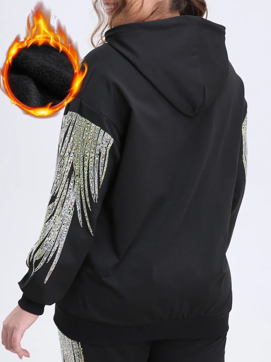 Plus Size Zip Up Women Hoodies Fleece Rhinestones Graphic Jacket Warm Soft and Thick for Winter Hooded Sweatshirt Relaxed Fit