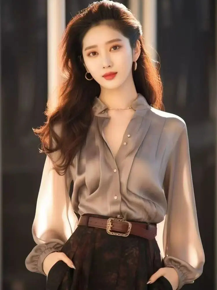 High Quality Beautiful Age-reducing French Design Sensibilityniche Grey Acid Silk Top Shirt For Women 2025 Spring Women Clothing