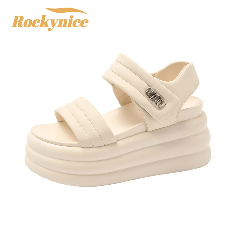 New Summer Women Chunky Sandals Leather High Platform Trainers Breathable Casual Slippers Shoes Woman 7CM Heels Wedge Sneakers