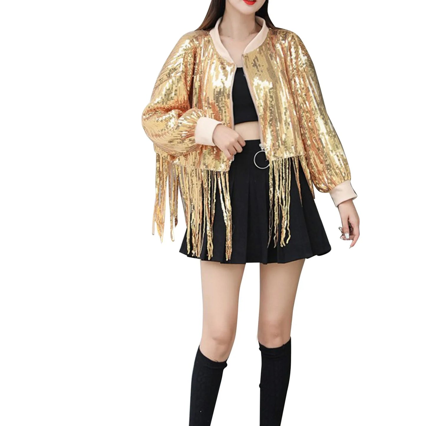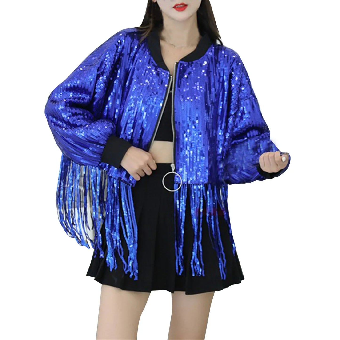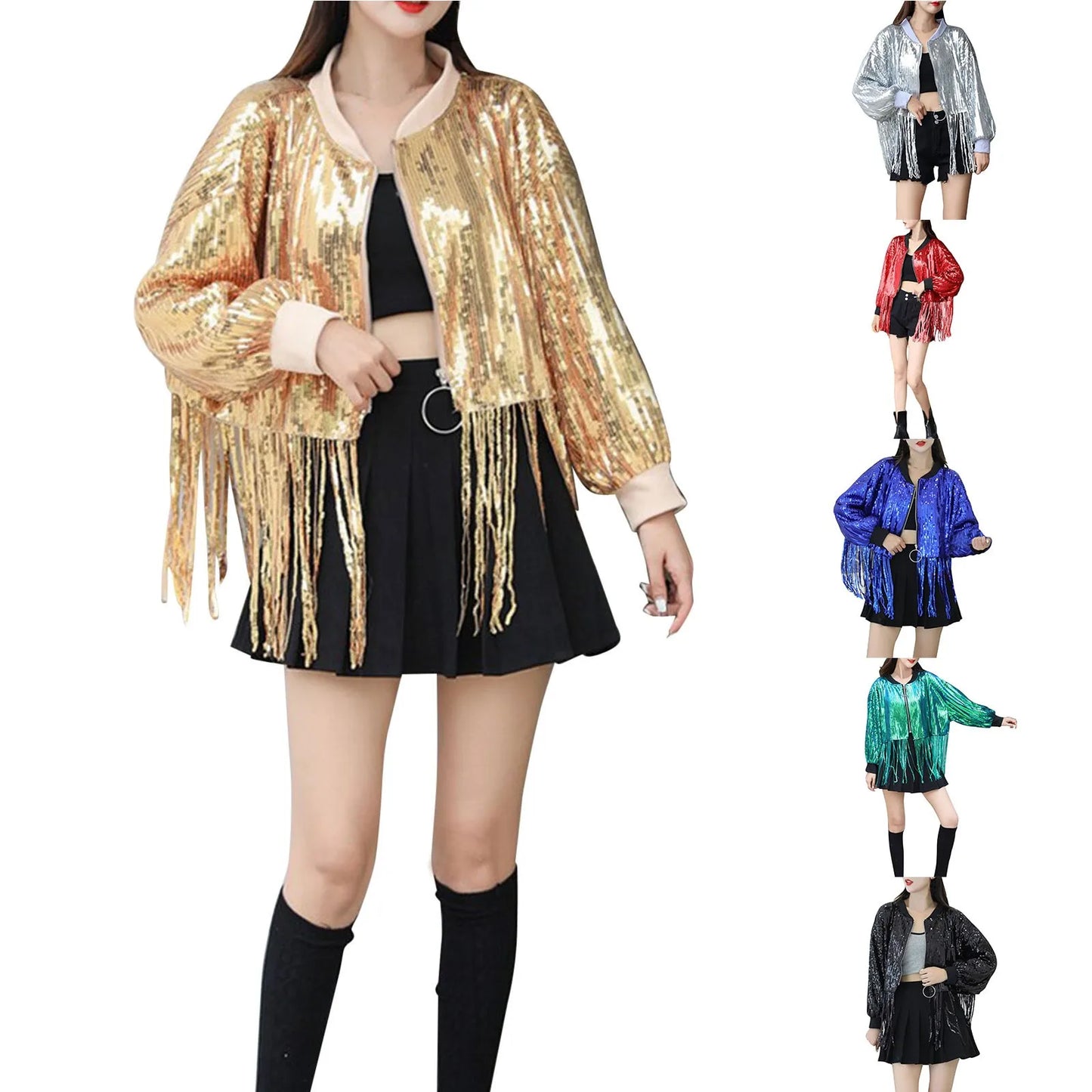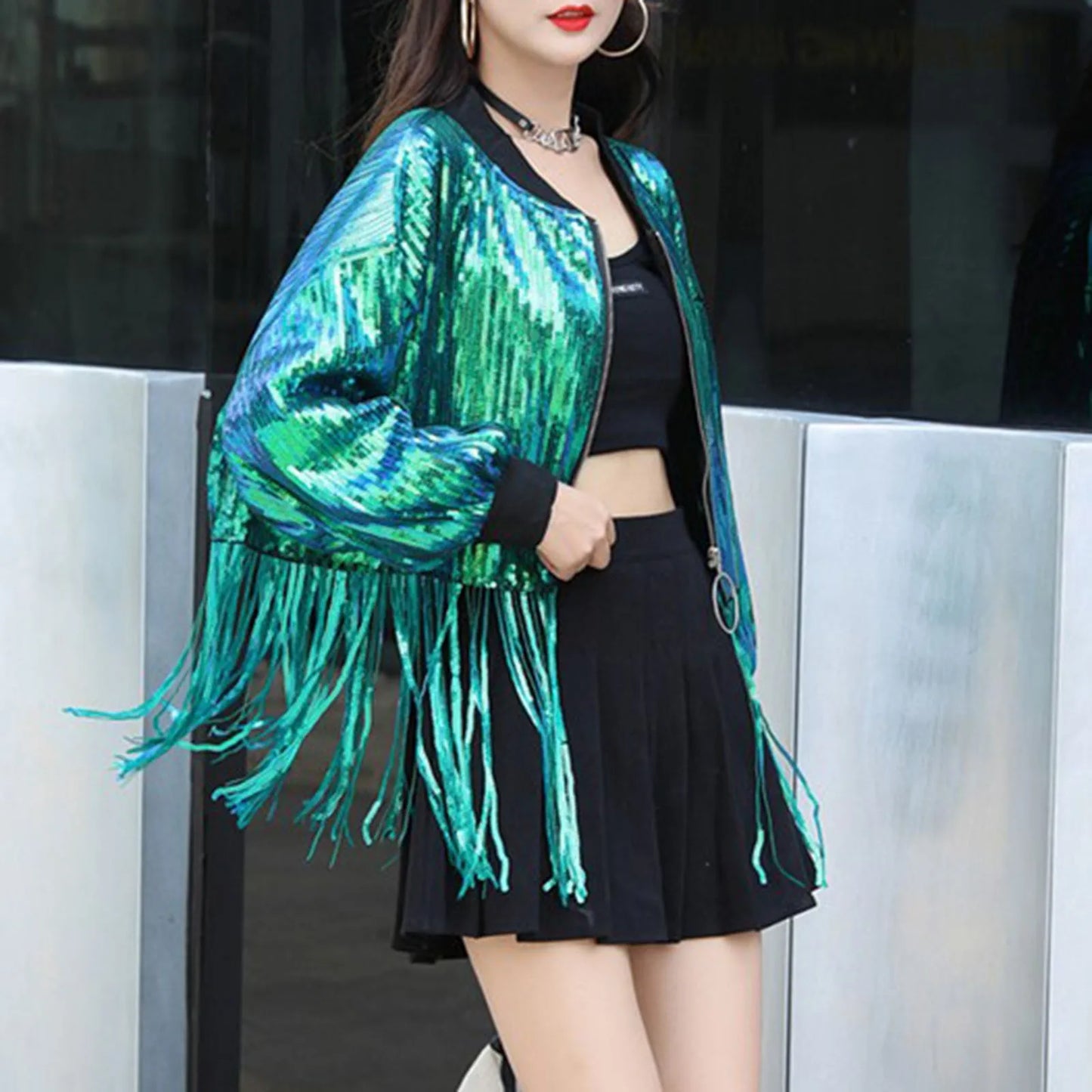 Tassel Sequin Jacket Zipper 2024 Autumn Winter Streewear Rock Dj Retro Long-Sleeved Silver Reflective Coat Women Outwear Tops