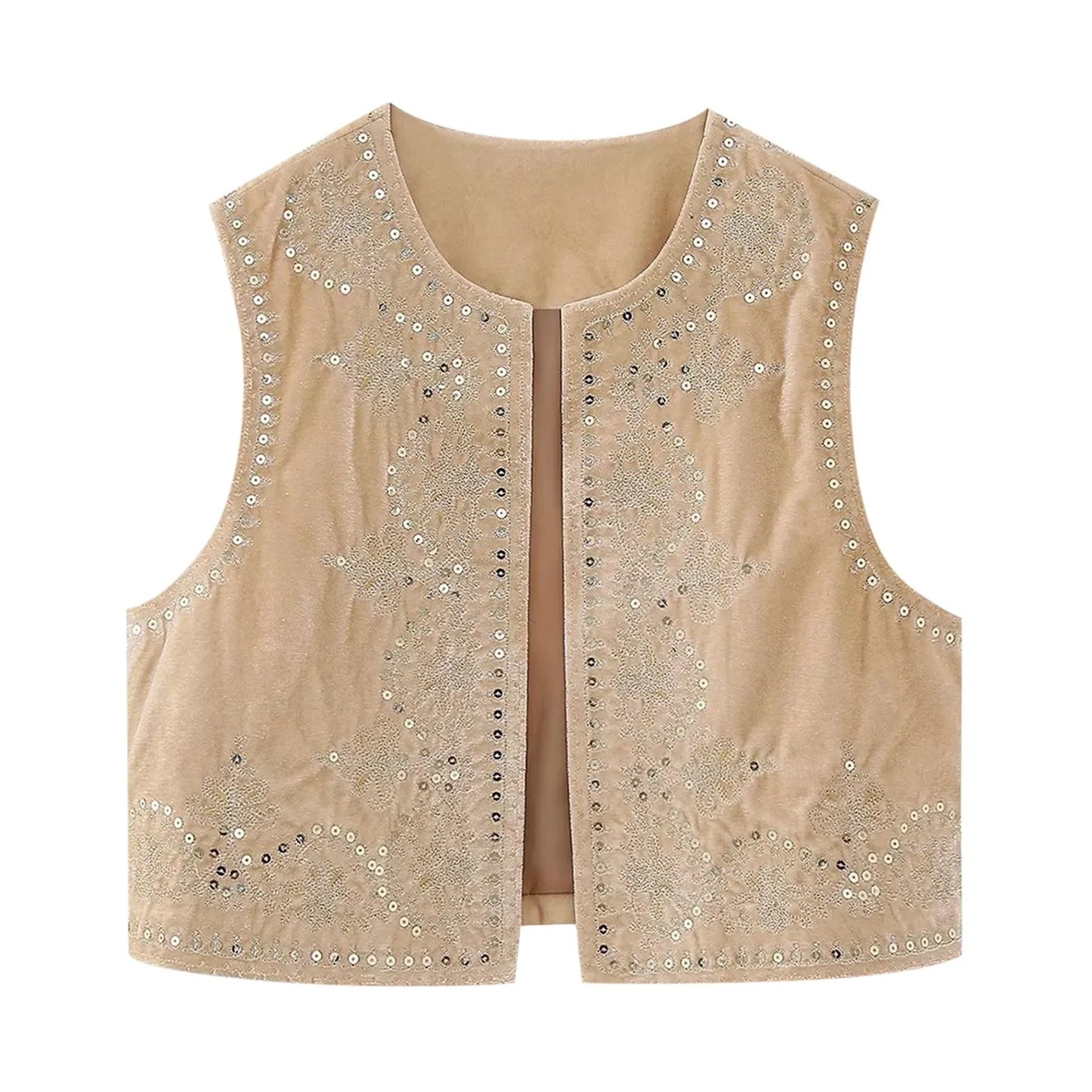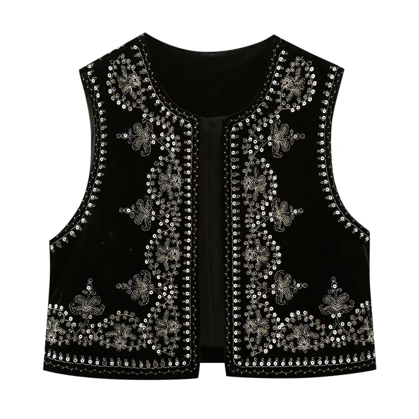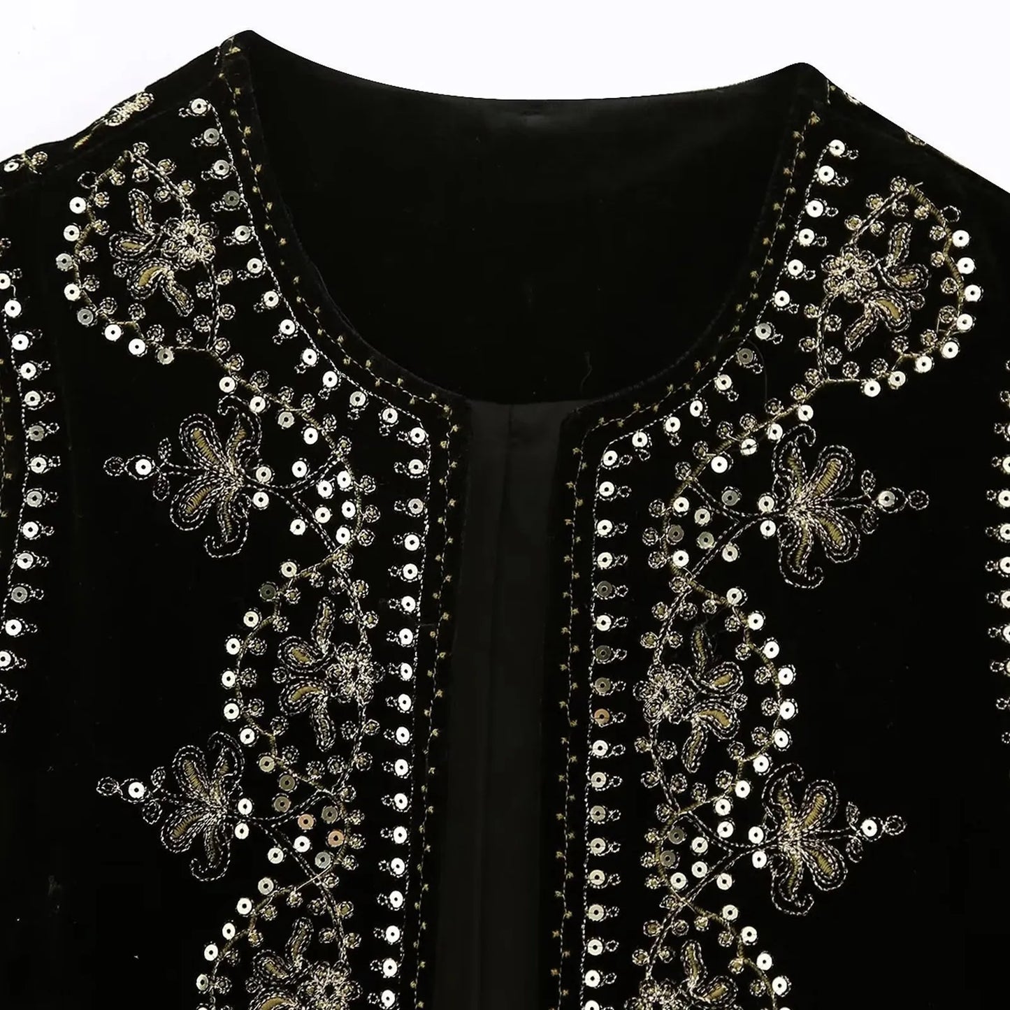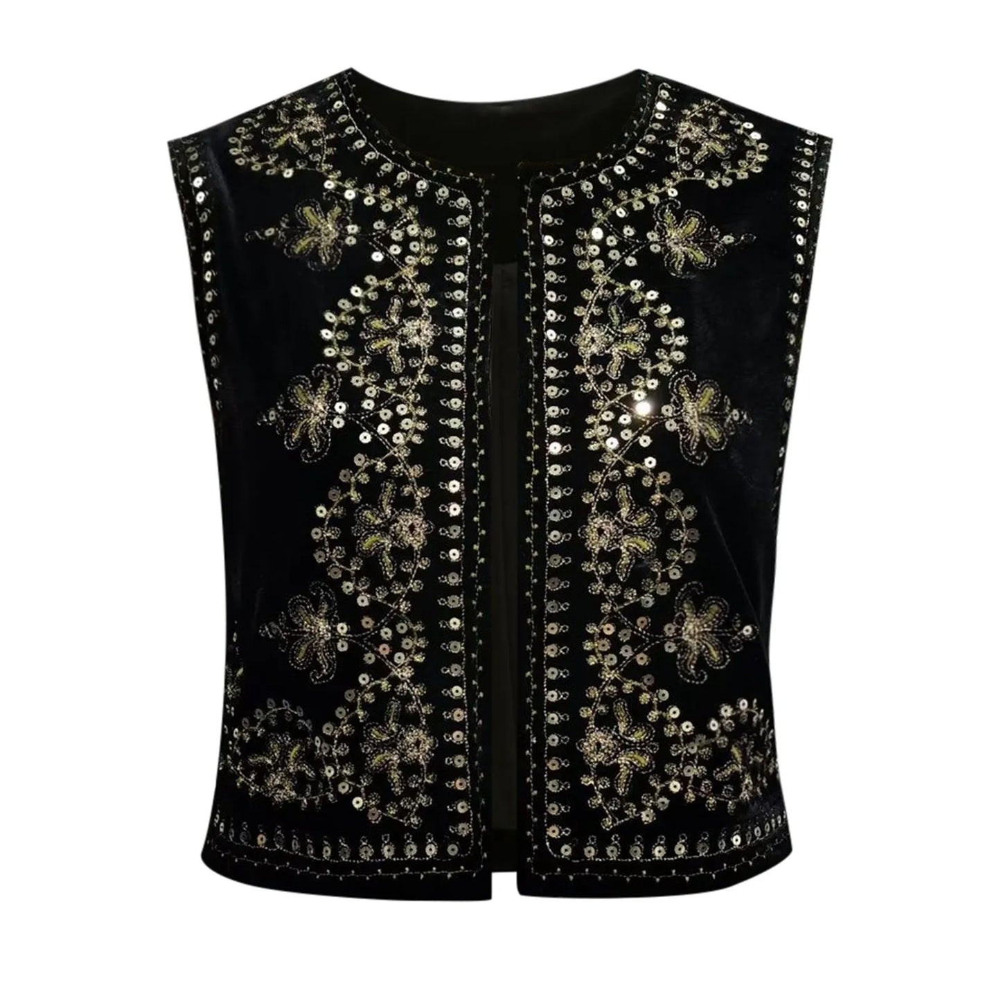 Women Retro Sequin Embroidered Velvet Vest Sleeveless Casual Jacket Vest Spring Autumn Vintage Coats For Women Elegant 2024