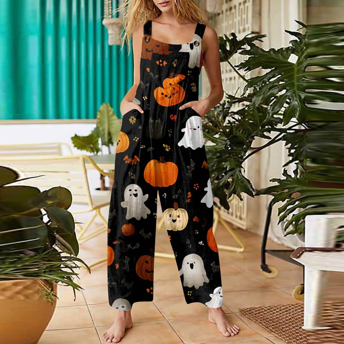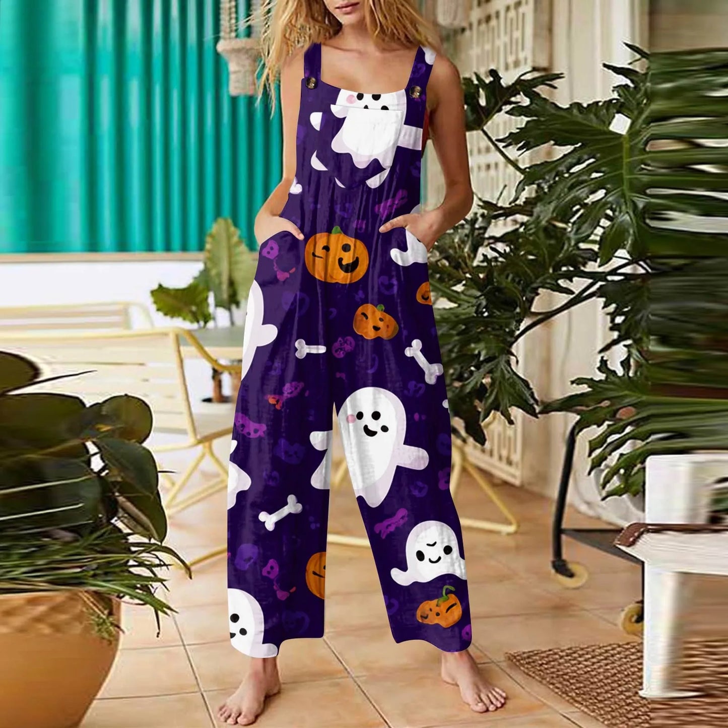 Women'S Fashion Halloween Print Casual Vintage Sleeveless Button Jumpsuit Cargo Pants Women Pantalones De Mujer Korean Fashion
